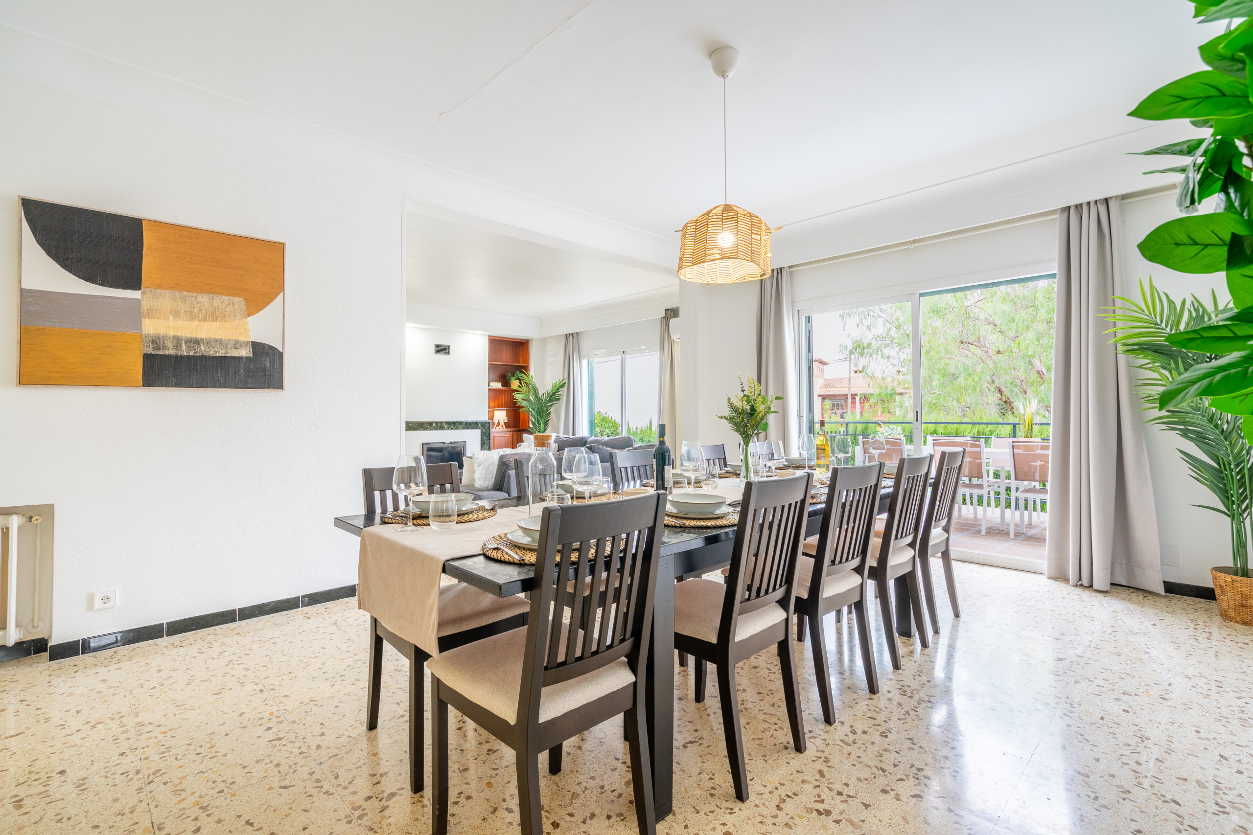 Dentro del chalet, encontrarás 6 cómodos dormitorios y 4 baños completos, lo que permite alojar a 12 huéspedes con total comodidad. El interior del chalet cuenta con una luminosa sala con chimenea y confortables sillones, además de una delicada decoración. Aquí podrás ver televisión o simplemente pasar el tiempo en la compañía de un buen libro. Junto al salón, encontrarás el amplio comedor totalmente equipado, así como la gran cocina con todas las comodidades para tu disfrute. Además, la propiedad cuenta con conexión a internet.