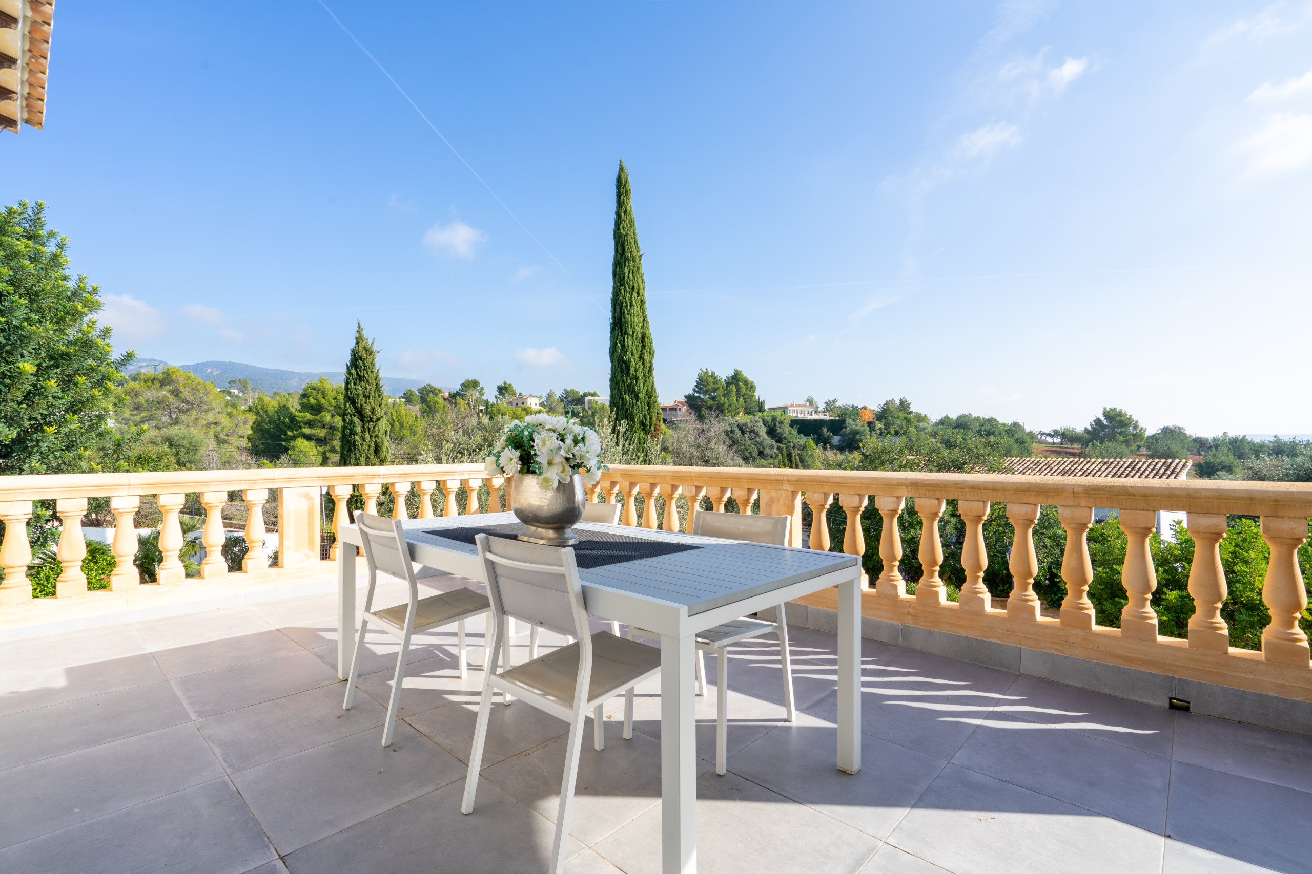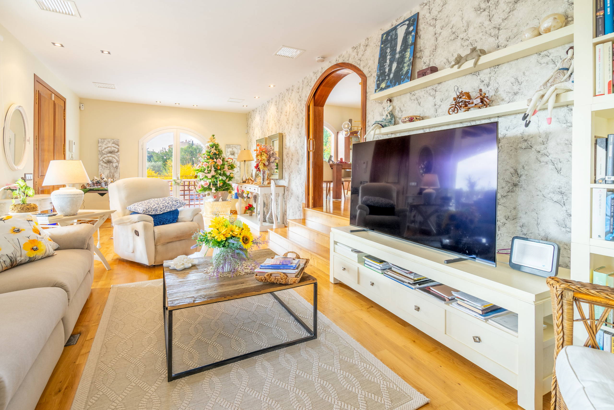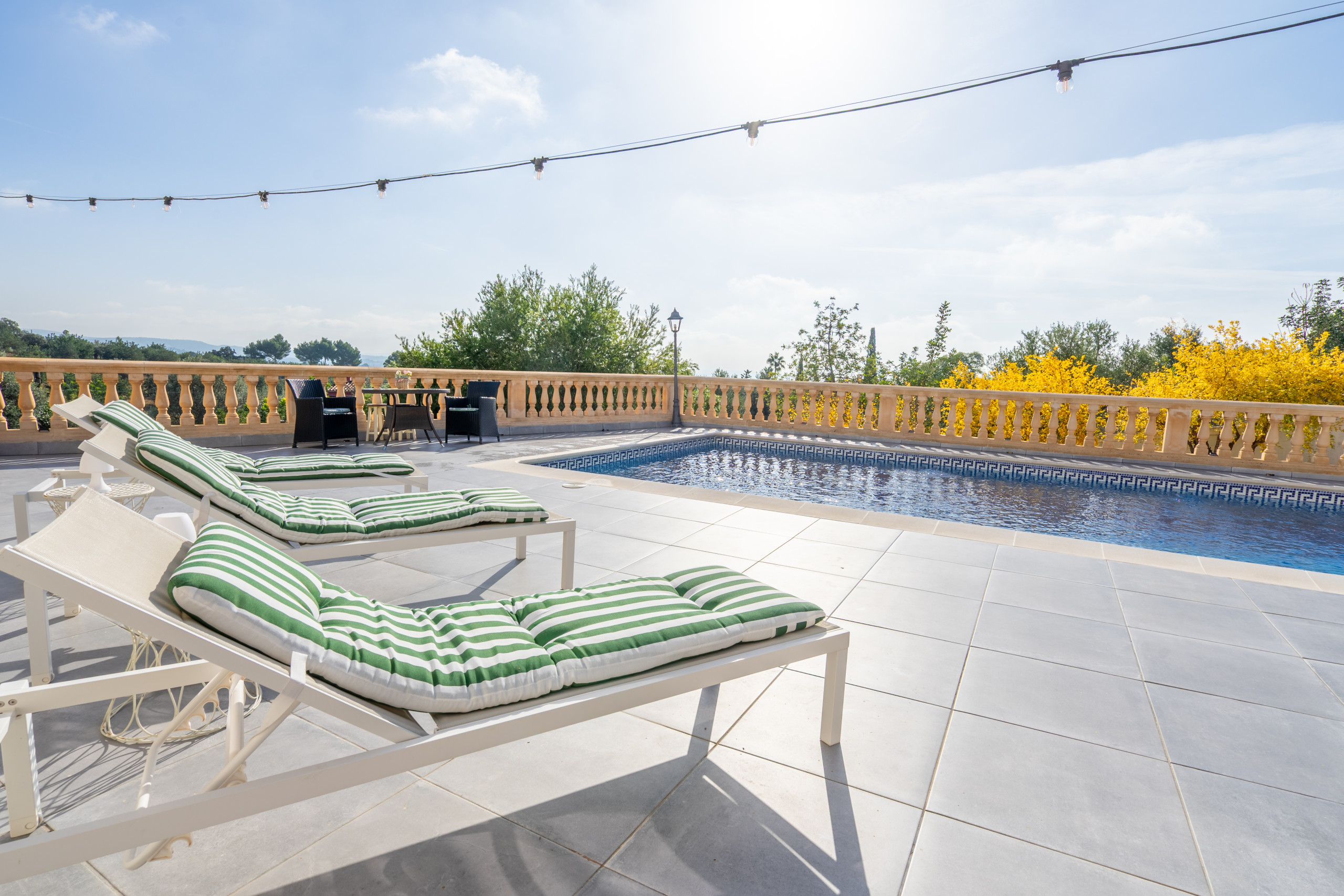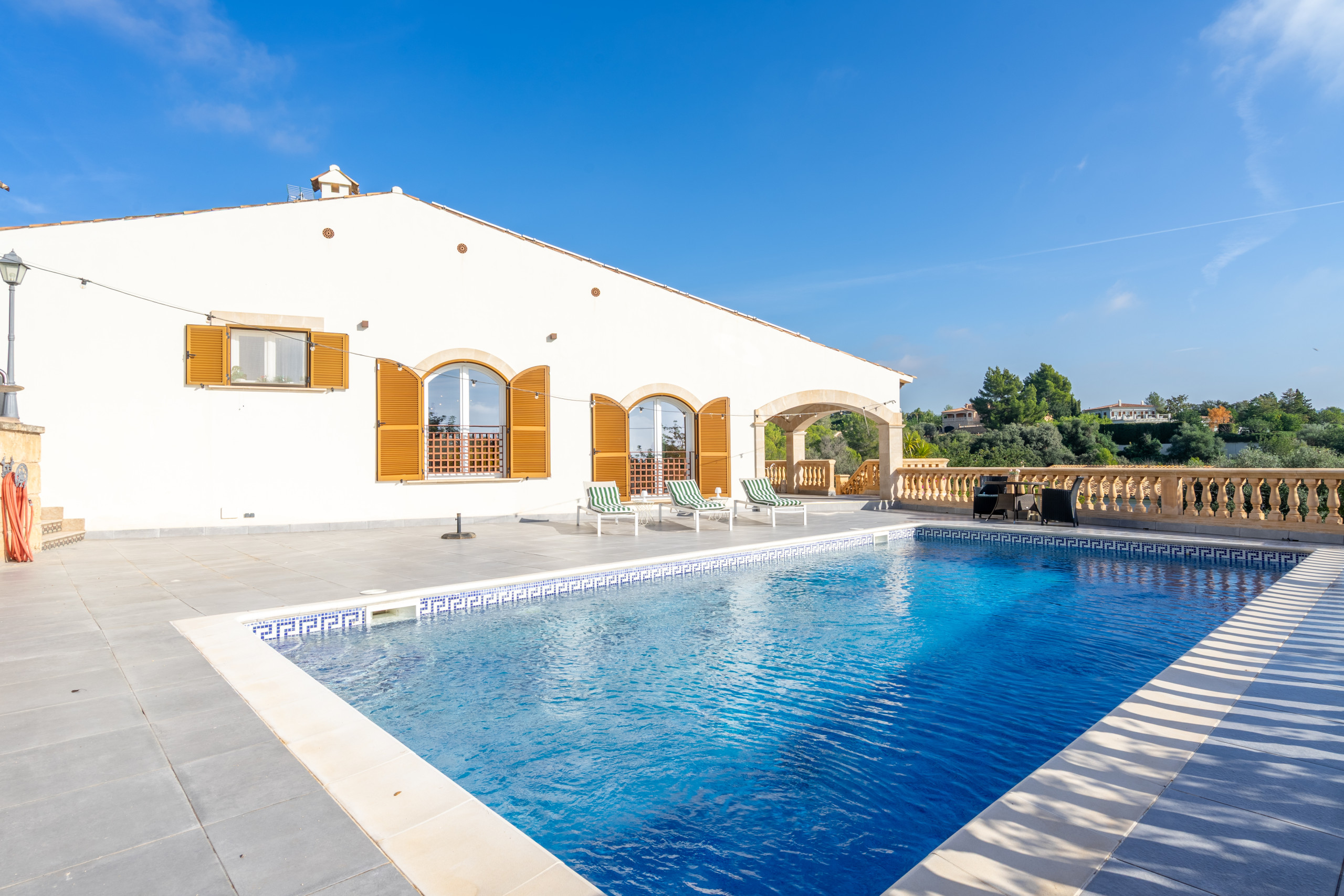La vivienda cuenta con 5 habitaciones, 4 baños y espacios amplios tanto en el interior como en el exterior. Su gran piscina privada es uno de los protagonistas de la casa: perfecta para refrescarse, relajarse bajo el sol y disfrutar de largas jornadas al aire libre, con vistas a la Serra de Tramuntana.