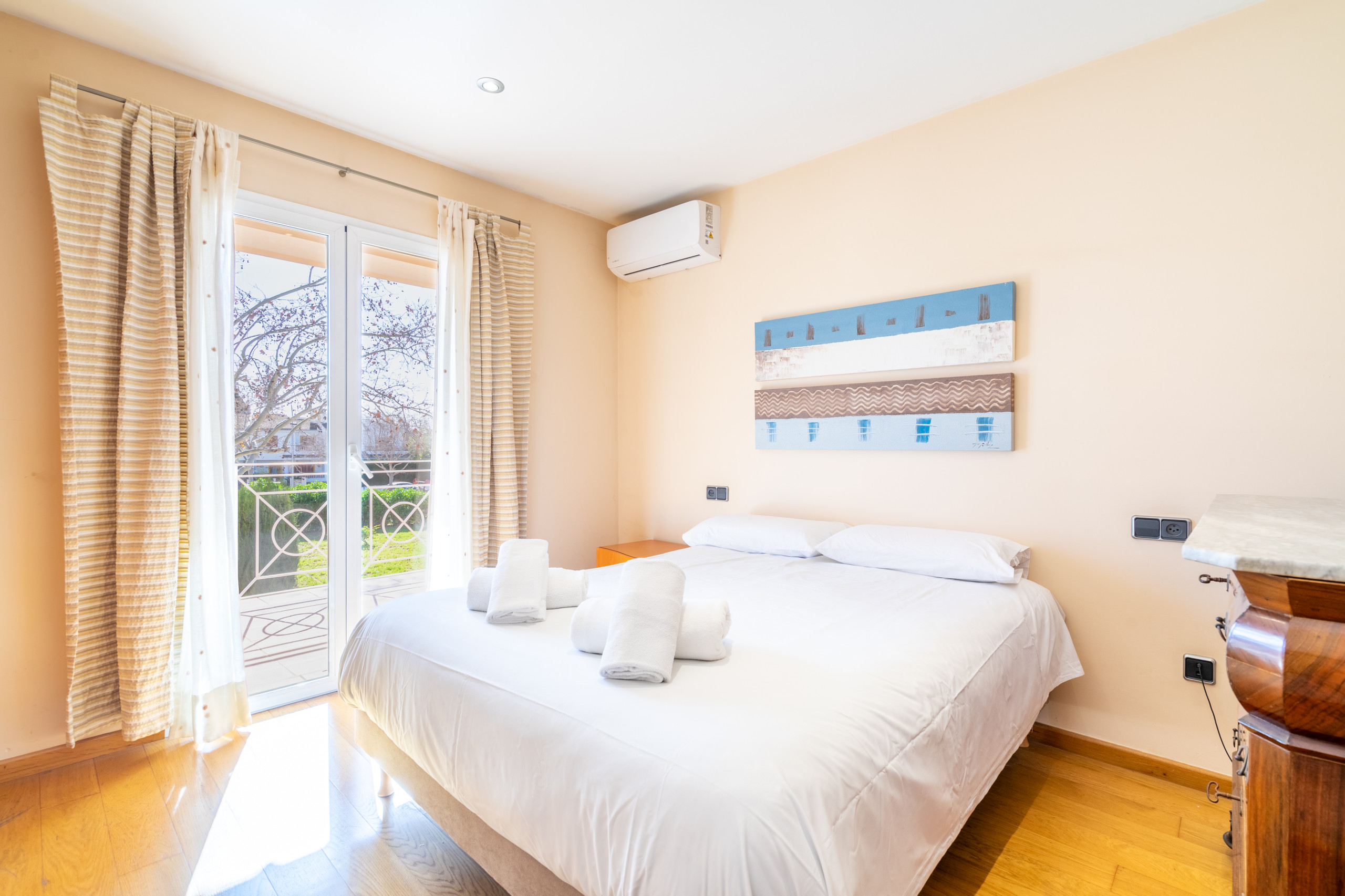 Preciosa villa situada delante de la playa de palma, en una zona tranquila y bien comunicada con supermercados, panaderías, bares y aparcamiento en las inmediaciones. La propiedad ofrece 4 espaciosos dormitorios con aire acondicionado, 3 cuartos de baños completos, uno de ellos en suite. Además de ello encontrarán a su disposición una cocina totalmente equipada y una acogedora sala de estar con vistas al mar.
